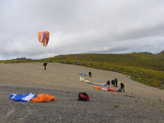 This week flying alongside our very small group is Sandy Cochepane´s group from Chamonix (X World Champion and Winner of the Europeans in Piedrahita in 1998). The picture shows them taking off for theie second flight. You will see from the photo that much of the mountain now full of the yellow Broom flowers. Every themal on the hill is a fragrant one.