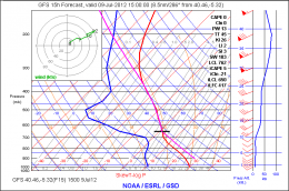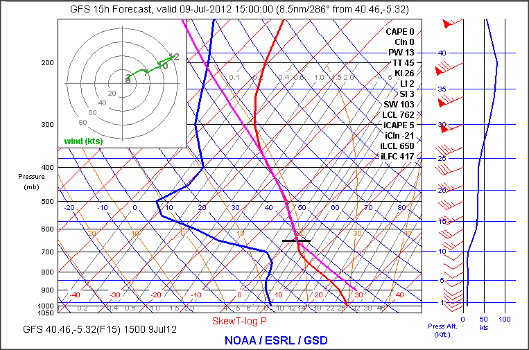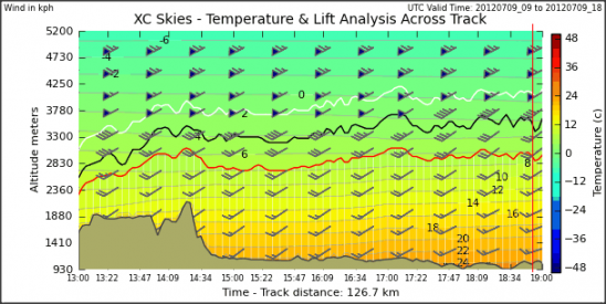Relative Low pressure with a upper level trough moving in Wednesday. Winds at 8.30am are S at take off. Winds in SW and good themal quality will give convergence out in the flat lands and should give us a good potential XC day. Wind speed is on the strong side with around 20km/hr at take of level and c40km/hr at 3000m. I imagine the wind will not come onto launch untill mid day, then the safe launch window may be quite short.