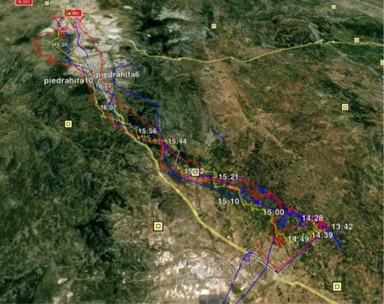 Very very nice conditions with the Cus holding throughout the day and solid pleasant climbs to base around 2900m. V light winds, tending to NNE towards Avila. We should have flown back at Muñogalindo, but due to the racket on the radio (culprit yet to be found), most had radios turned down so planning was not so effective. Steve and Simon down in the light headwind before the Y junction, but Gill able to scamper back to land back towards the Bend in the road after gettting about 4km short of the Y.