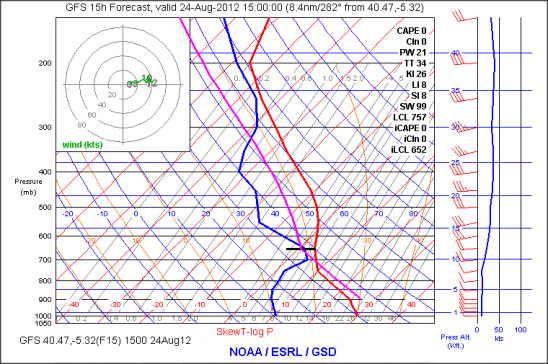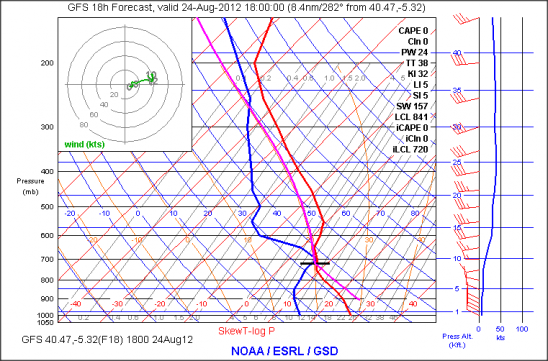 The wind at PN is crossed along the hill at 8.30am, so probably it will come on. Winds in West and going more North at the end of the day. A strong inverstion near take off altitude rising only to around 2600m durng the day. Some climbs to maybe 2800 later in the day, but stronger winds aloft will make it turbulent. Expect once again strong winds in the Ambles Valley and compression at the Pass and strong downslope winds in the Vicinity of Villaotoro.