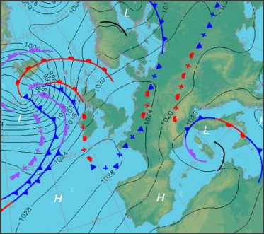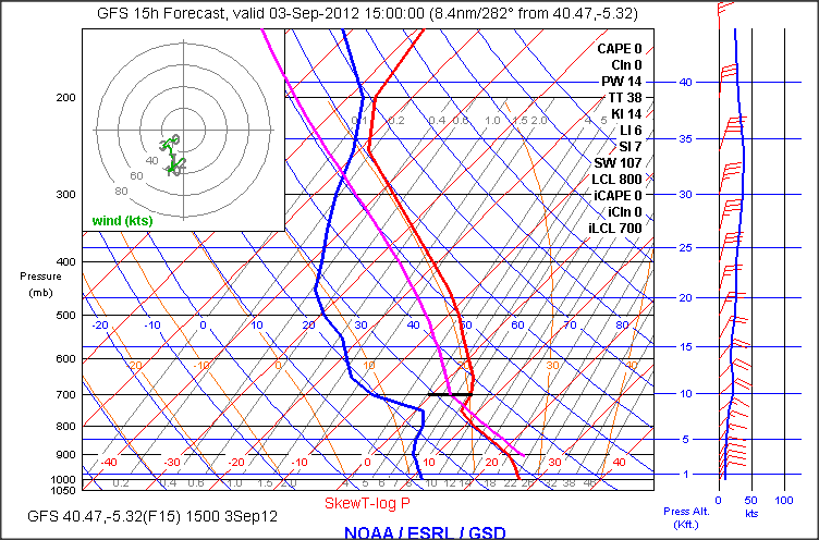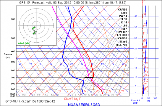 High pressure to the West in the Atalantic and low pressure in the Mediterreanean giving us N to NE flow over the Peninsula. Very strong winds at costal areas but a reduction on yesterday for us. Still cool, though better than yesterday with top temp expected to around 23ÂșC. Inversion at around 2100m and at 2600m with climbs not much over the latter.
