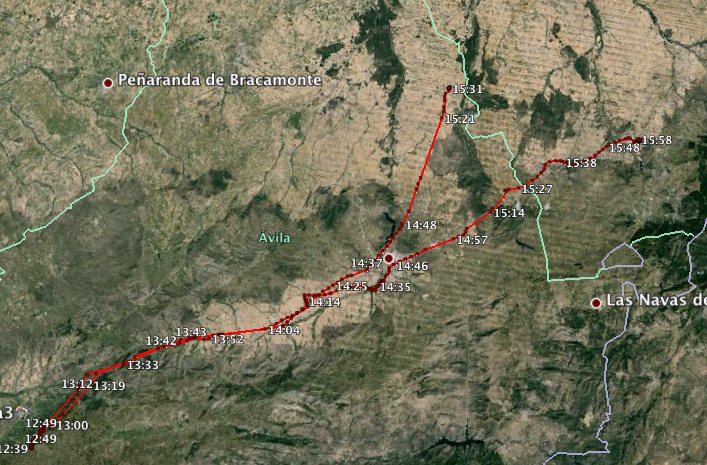 A very  strong thermic day  with winds similar to forecast.  All over Pass except for Fred and Dave S. Very strong and hard to get down towards Avila and many of us looked for sink to find a landing.  Mark went on to Sanchidrian (80km) and Beat (99km) to Past Villacasting,   Felix down North of Avila.  Big build ups towards Segovia.