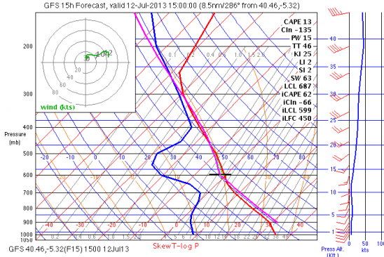 Still under the influence of the heat low with a trough to the N of the Peninsula.  The Skew T looks less threatening today with a little more stability from around 3000m which reduced the threat of Cbs.  The wind is SW and because of the relative stability of the trace (trigger temp around 30ºC) it may be a long time before the wind comes on at Peña Negra.