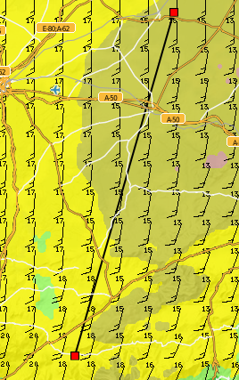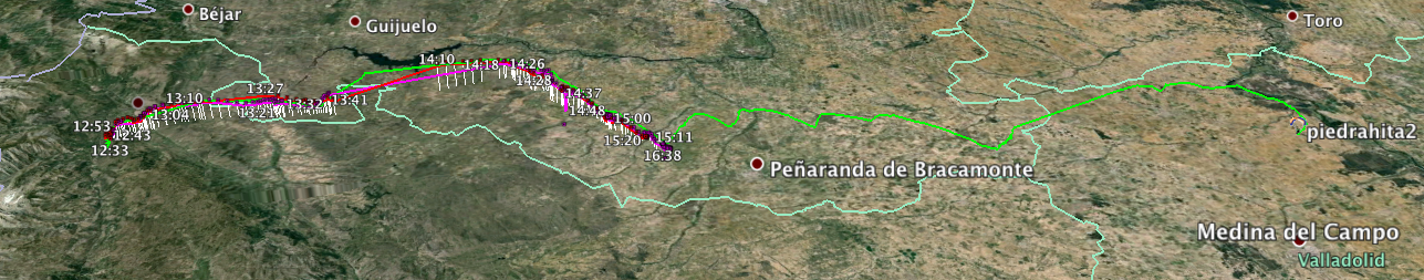 A great day at Lastra will all but Felix climbing out and going over the back.  Felix made an top landing to the W of the firewatch tower.   Our pilots thinned out after crossing to the N of the Piedrahita valley, with landing around Gallegos de Solmiron.  Mark, Ian, Nigel and myself finally got over 3000m at this point and continued towards Salamanca, though swinging more to the East some 15km short of Alba.  Ian and mark went down after 50km or so.  Soon after Nigel and I climbed near a large stubble fire in quite dramatic lift.  I carried on to 90km not turning much for those 40km and landed to have a look at Madrigal de las Altas Torres, but unfortunately I got the town wrong.  Nigel carried on to 122kkm to near Tordesillas, another historic Castillian town.