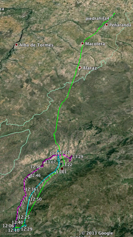 Surprising light winds at Lastra, with hinds of N and W. Good climbs to around 3000m. I led and landed near home as the sky looked like it would get windy. Peter and Marting both flew back to the Piedrahita Valley as well. Dave headed north making good progress to past Peñaranda de Bracamonte with 72km.