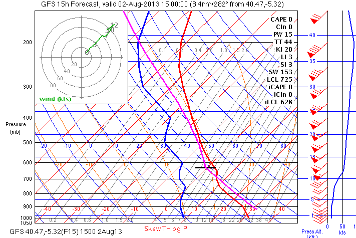 A weak cold front going through which is considerably weakened by the high pressure at surface level.  25-30km/hr at 1500m, 65-85km/hr at 3000m.