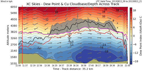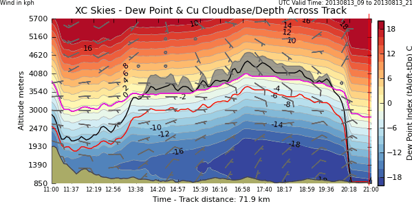 Cloud base over 3000m and rising to near 4000m in the late afternoon, but like yesterday, that can only be utilised if it does not go to Cbs.  The XC section below is a  flight to the Pass beyond Barco as that would be the downwind direction today.  If conditions are good and we can fly to the NW and not to Barco, that would be best, avoiding much of the build up on the mountains.