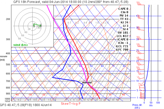 The passage of a cold front has cooled and moisened things somewhat an this morning the clouds have been below take off level. This should change by late morning and by mid afternoon we should have thermals to 2500m, probably rising to a little above 3000m by late afternoon. The W winds should once again allow us to fly towards Avila, though getting over the pass may be a little more difficult as the thermal heights are lower than yesterday. However, a Flight to Avila is not unrealistic for todays conditions.