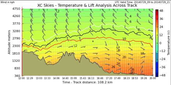 The cold front has passed leaving us with a cooler NE flow. The is an inversion around 2600 and a further kink at around 3000m. Lower level winds are light (supposedly) and winds above the boundary layer seem to be more W. I don’t think this day will provide an amazing XC day like we have been seeing over the last week or so. Post frontal days in summer normally drop the thermal heights considerably, successive days should become warmer with higher climbs.