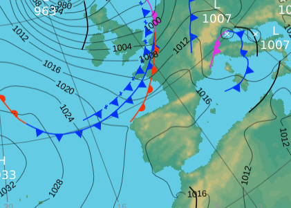 very light winds, N high and W low. Some Mick and Karl managed an out and return to Barco, then to nr Villafranca and back, clocking up around 60kms. Others near Barco and most getting plenty of airtime.
